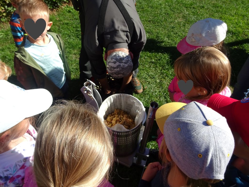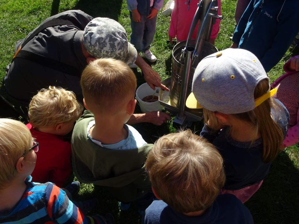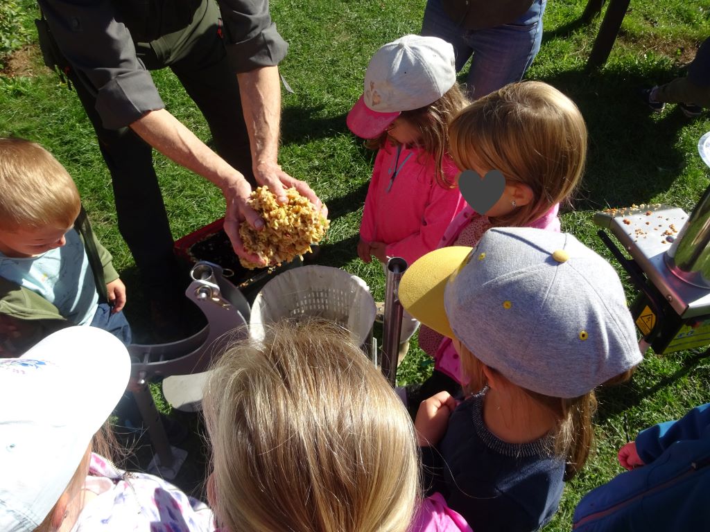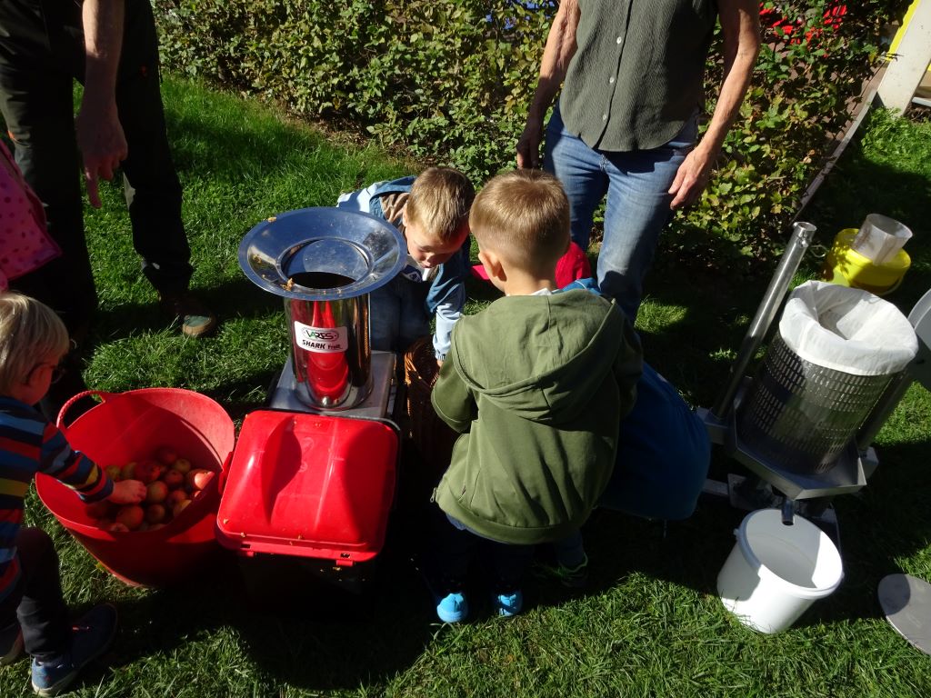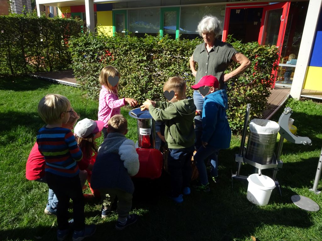 Aus den Äpfeln des Baumes in unserem Kindergarten haben wir Saft gemacht. Mit Hilfe der Großeltern unserer Erzieherin Lena W. haben die Kinder die Äpfel eingesammelt, gewaschen, in den Schnitzler und dann in die Presse gegeben. Heraus kam naturtrüber Apfelsaft. Dieser wird jetzt noch gekocht und abgefüllt. Ab Montag gibt es den leckeren Apfelsaft als Schorle hier im Kindergarten. Tolle Aktion! Danke!