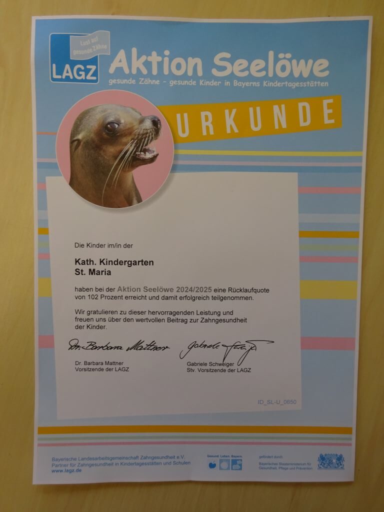 Jedes Jahr machen wir bei der „Aktion Seelöwe“ der bayerischen Landesarbeitsgemeinschaft Zahngesundheit mit e.V. mit. Kleinpreise wie CD´s und Kuscheldecken oder einen Hüpfball haben wir schon oft bekommen. In den Genuss eines größeren Gewinnes sind wir heuer gekommen! Es gab einen Gutschein im Wert von 60€ für unsere Einrichtung. Einzulösen bei Wiemann Lehrmittel. Wir haben uns sehr gefreut.