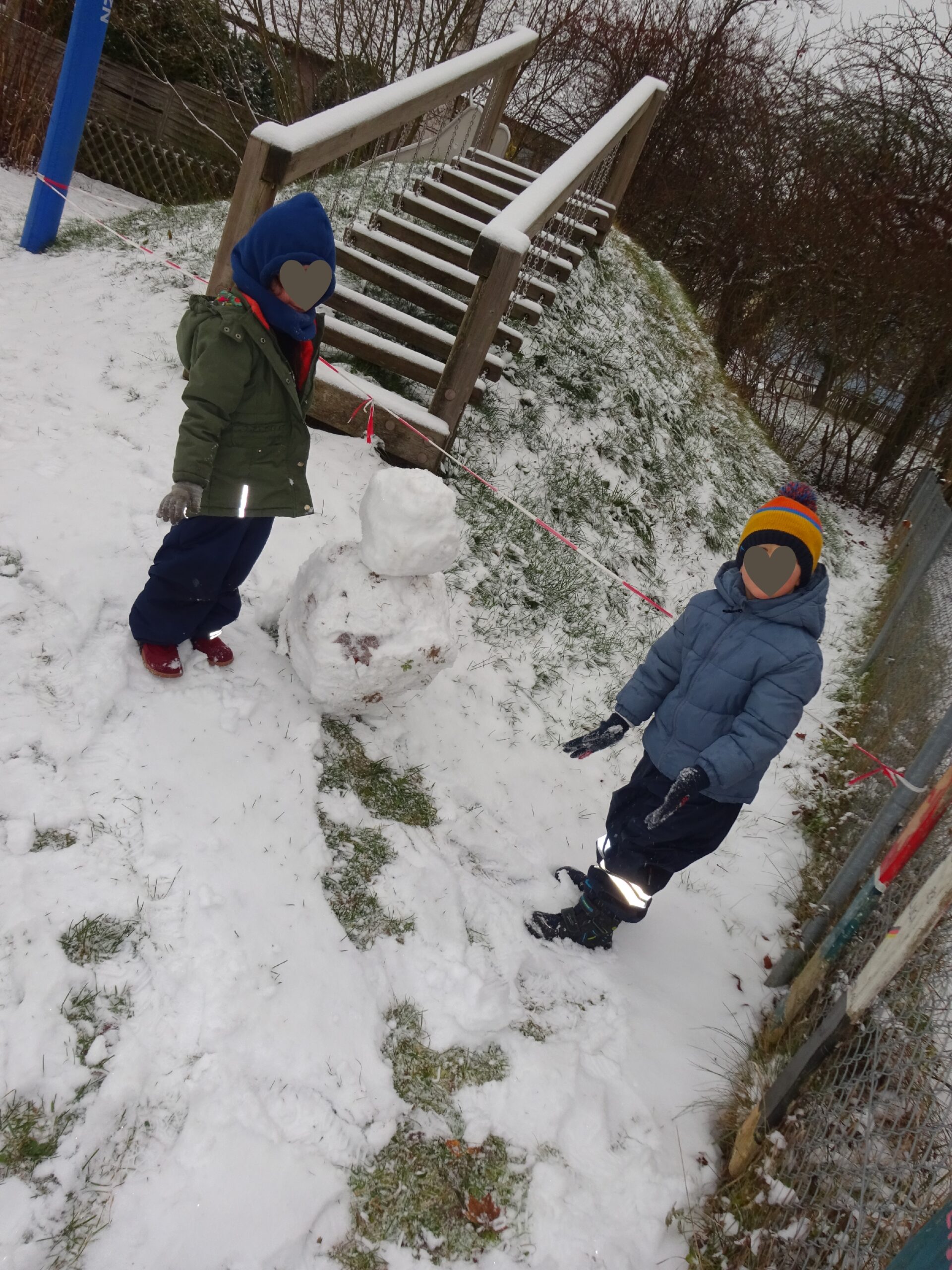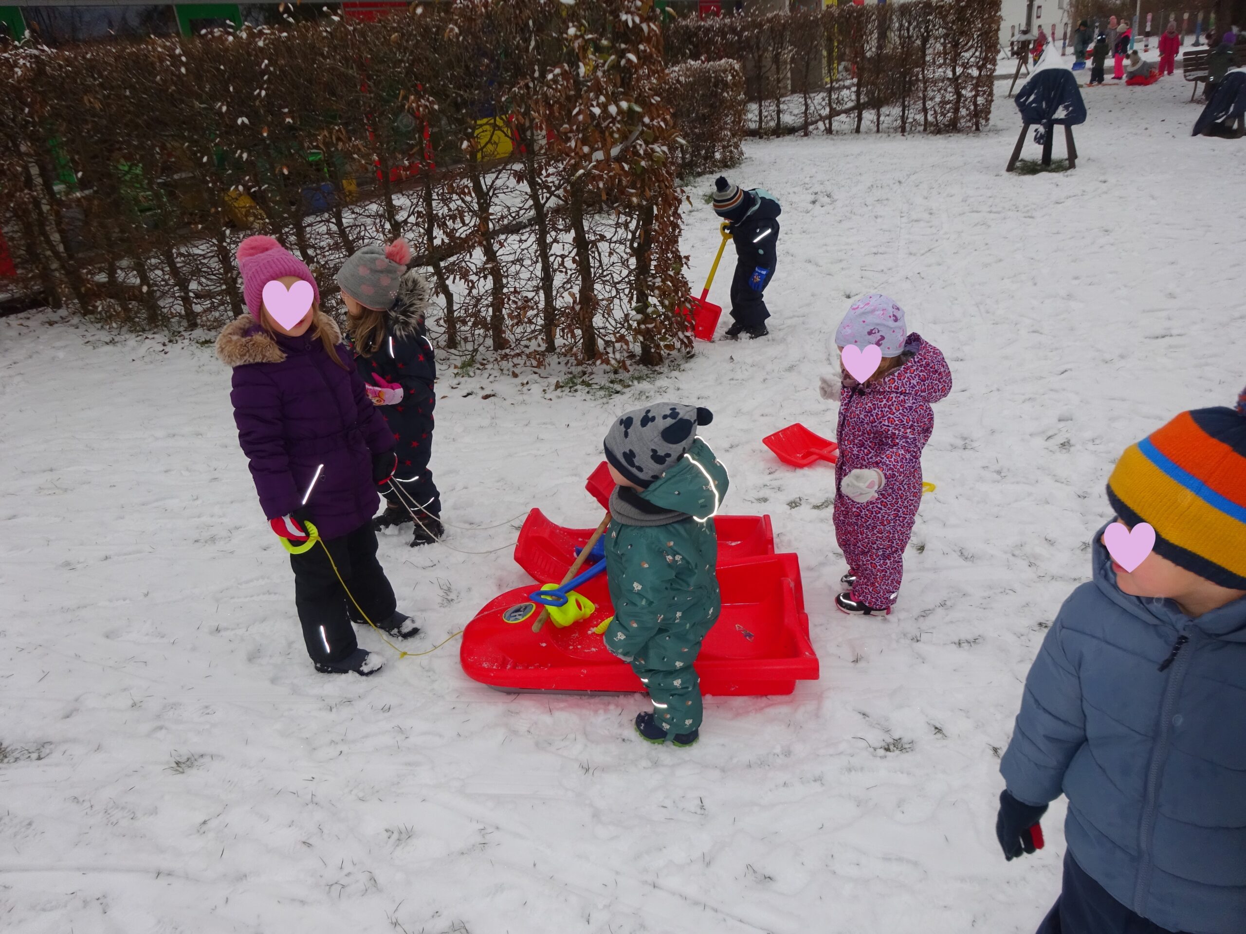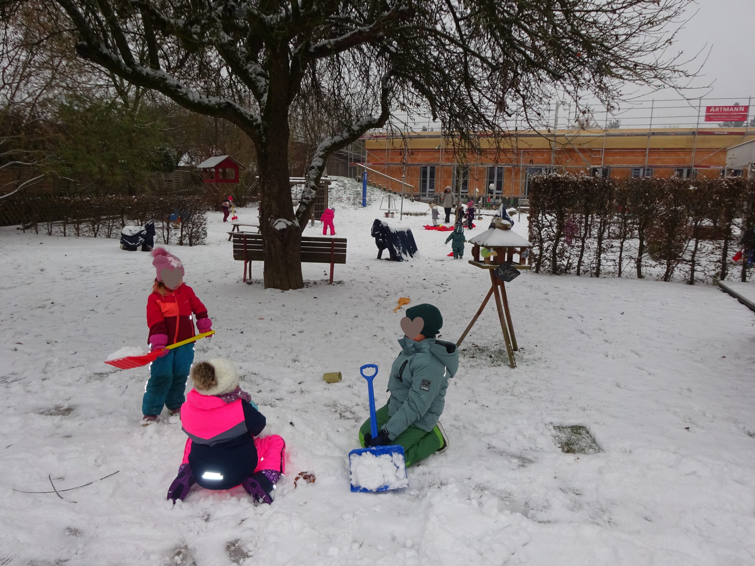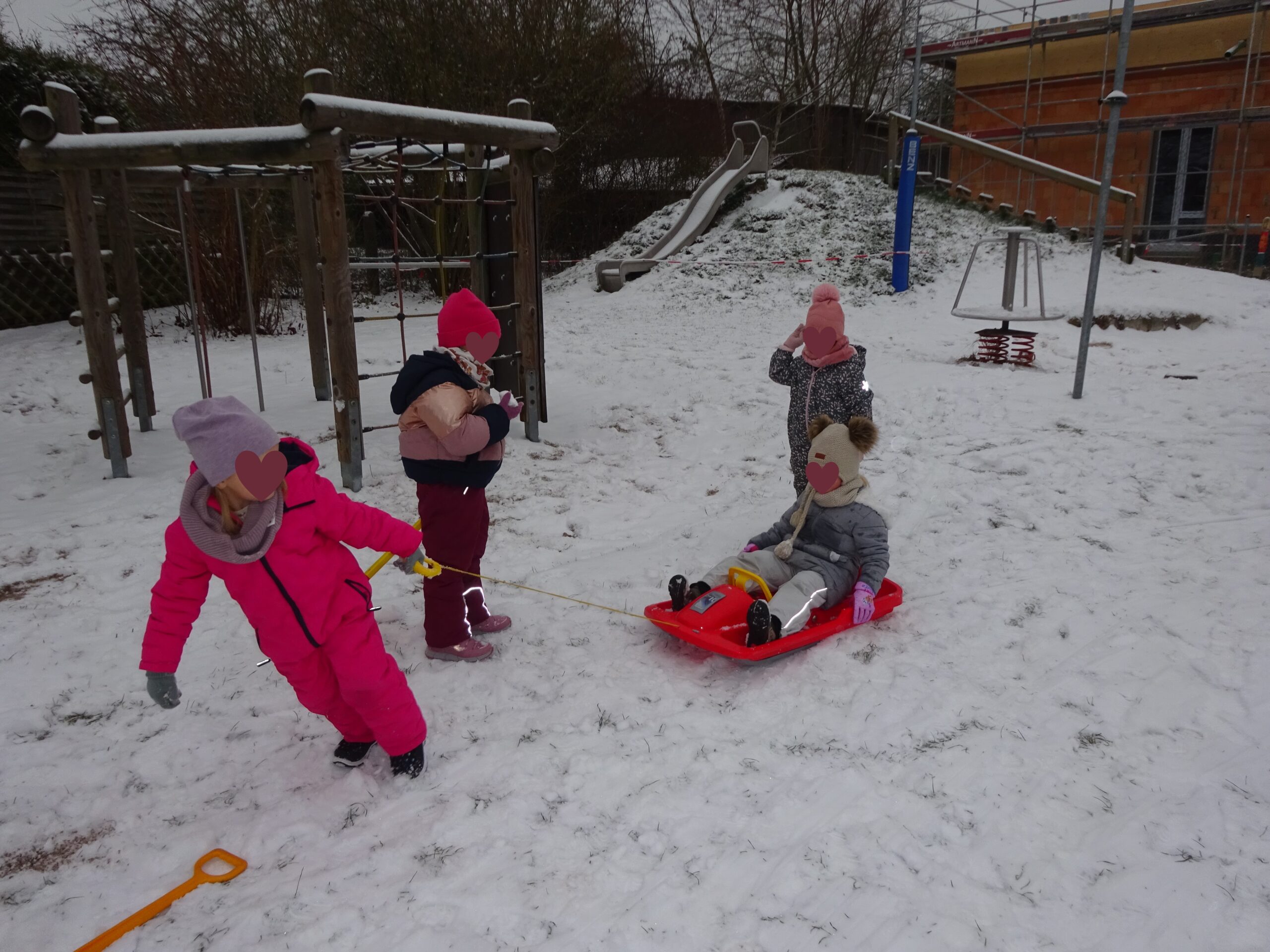 Als der erste Schnee gefallen war sind wir kurz entschlossen gleich nach der Bringzeit und dem Morgenkreis hinaus gegangen. Die Kinder konnten mit den Kunststoffschlitten, den Schneeschaufeln und was ihnen noch als Werkzeug in den Sinn kam, „arbeiten“. Pferdeschlitten waren somit im Garten unterwegs, Iglu-Bauer, Schneeräumer, Schneemann-Bauer und noch mehr. Ein wunderschönes Vormittags-Schnee-Erlebnis.